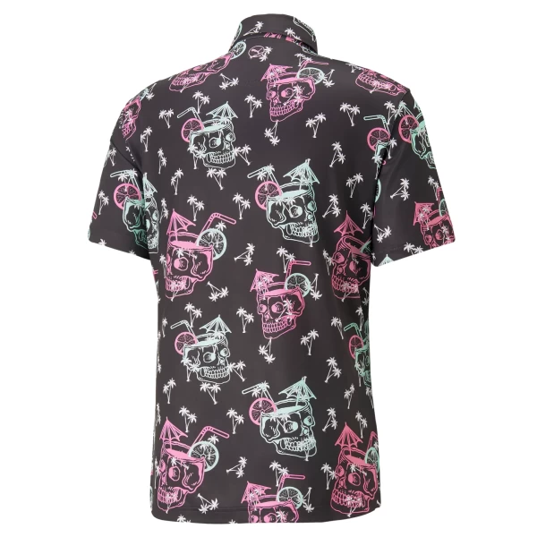 Get Tropi-cool with a skull cocktail and palm trees in this too-cool-to-miss button up shirt. Featuring MATTR fabric technology, this top is designed to fight back against all environmental hooks and slices the day might bring you. Extreme conditions are