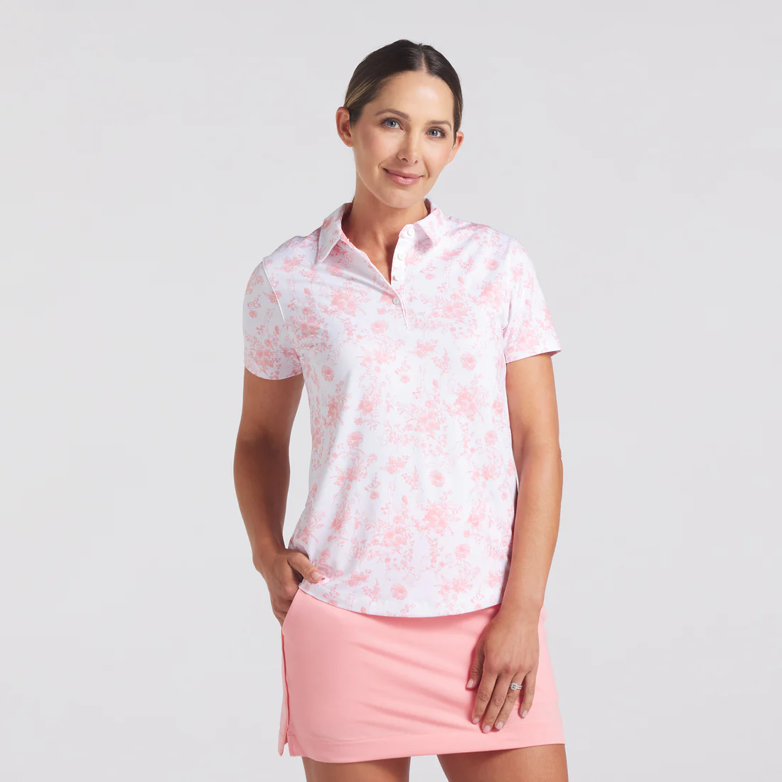 Pretty in pink. Powerful in performance. Once you feel it, you’ll love it even more. CLOUDSPUN material is incredibly soft, sweat-wicking, and stretchy, giving you the comfort and confidence to swing with power. Crafted with at least 90% recycled materials.